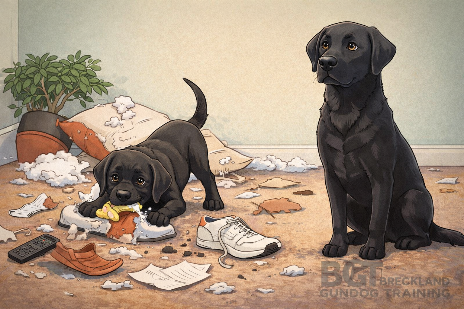 Mouthing, jumping, chewing, over‑arousal, poor recall, lead pulling — these are the problems that overwhelm new owners. A part‑trained youngster has already had these behaviours shaped and controlled.